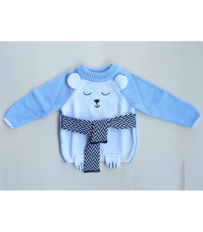 Jersey oso polar en blanco con las mangas celestes de original diseño. Tiene orejitas, patitas y bufanda.