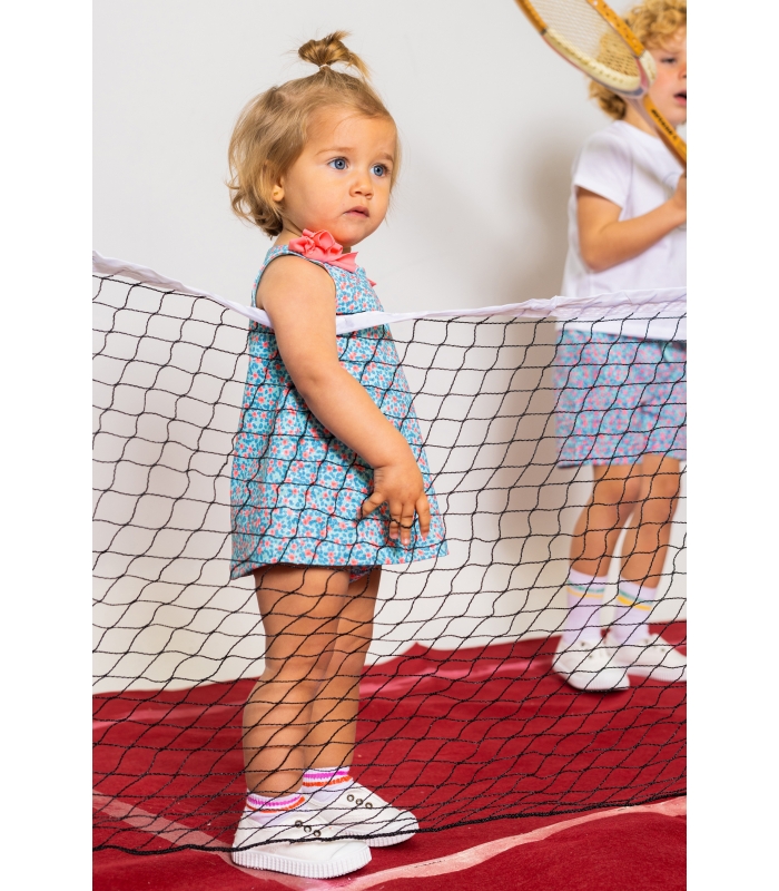 Vestido baño en tonos turquesas con flores coral y dos lazos en los hombros.
