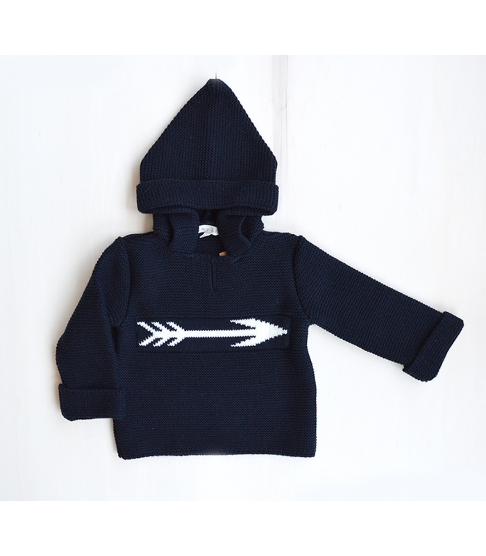 Jersey negro de punto con flecha en el pecho y capucha de Mía y Lía.