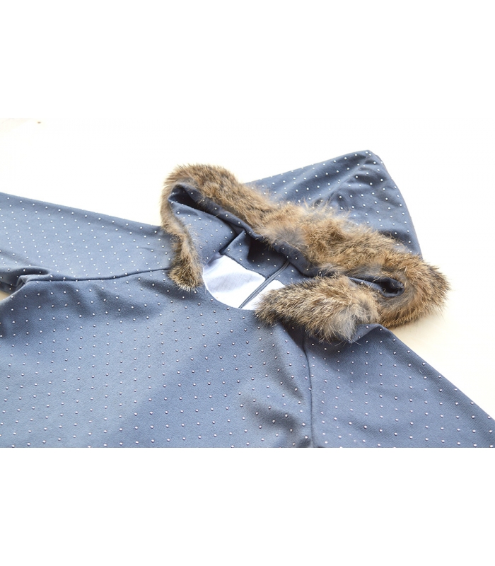 Vestido gris azulado con mini topitos metálicos y capucha con piel