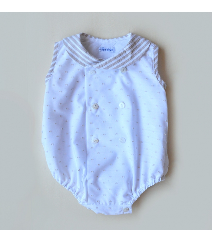 Pelele blanco plumeti beige y rayas en cuello y vivos de las mangas