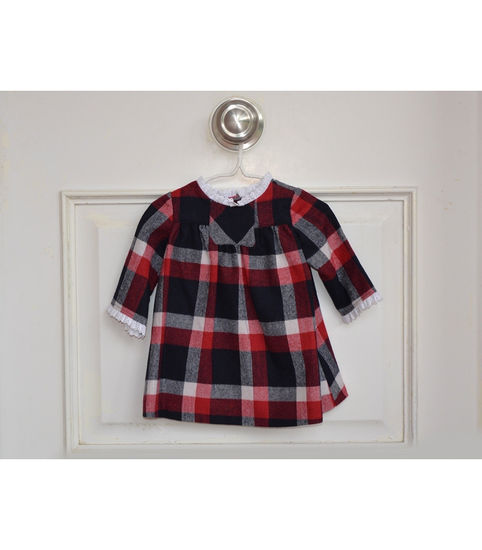 Vestido de cuadros azul marino y rojo con tira bordada en el cuello y mangas