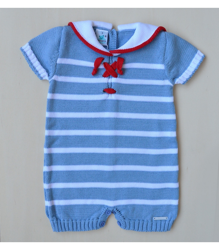 Pelele Navy de punto con rayas en tonos azules empolvados y cuello marinero con cordón rojo.