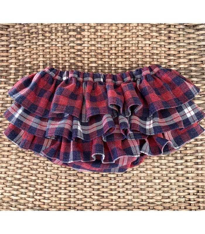 Ranita de cuadros rojos y azul marino con tres volantes.