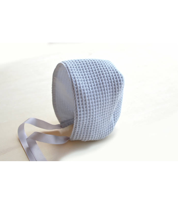 Capota de bebé en tonos rosa clarito y azul empolvado. Lleva gomilla por detrás en la nuca para que se ajuste mejor y lazo de algodón.