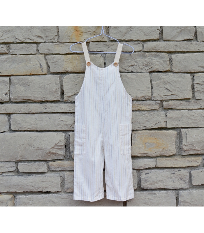 Es beige con rayitas en tonos nude, amarillo mostaza y azul denim. Tejida en lino de algodón, con bolsillos a los lados, y botones de madera.