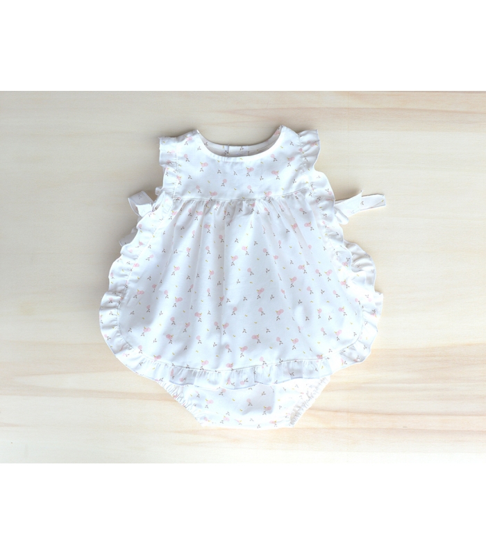 Jesusito de fondo beige con limones en color rosa. Es abierto y se cierra con dos lazos en los laterales. Tiene braguita a juego con dos volantes que se pide a parte.