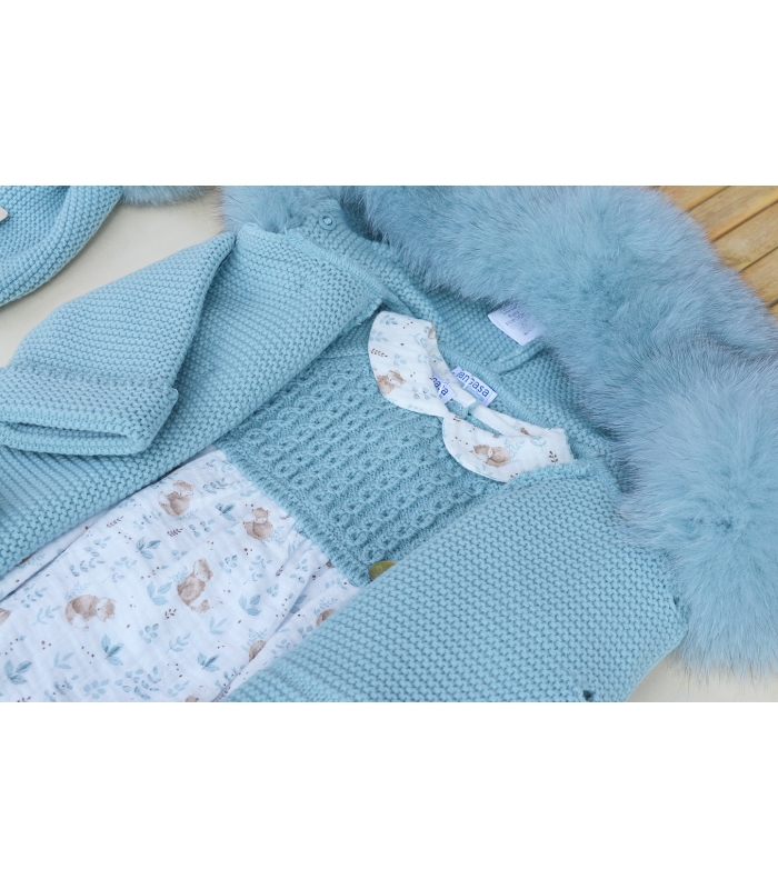 Pelele de punto en la parte de arriba haciendo el dibujo de ochos y tela con un tierno estampado de zorritos.